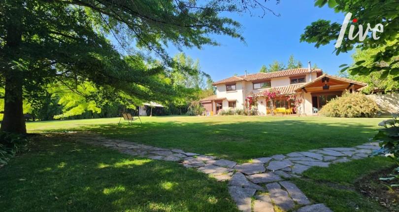 Bello jardín riego automático con árboles grandes, piscina, canil, cancha de tenis, casa de inquilino de 36 m² apto para sala multiuso con baño.