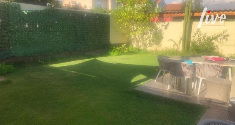 Antejardin, 2 estacionamientos, patio trasero jardin formado, quincho.